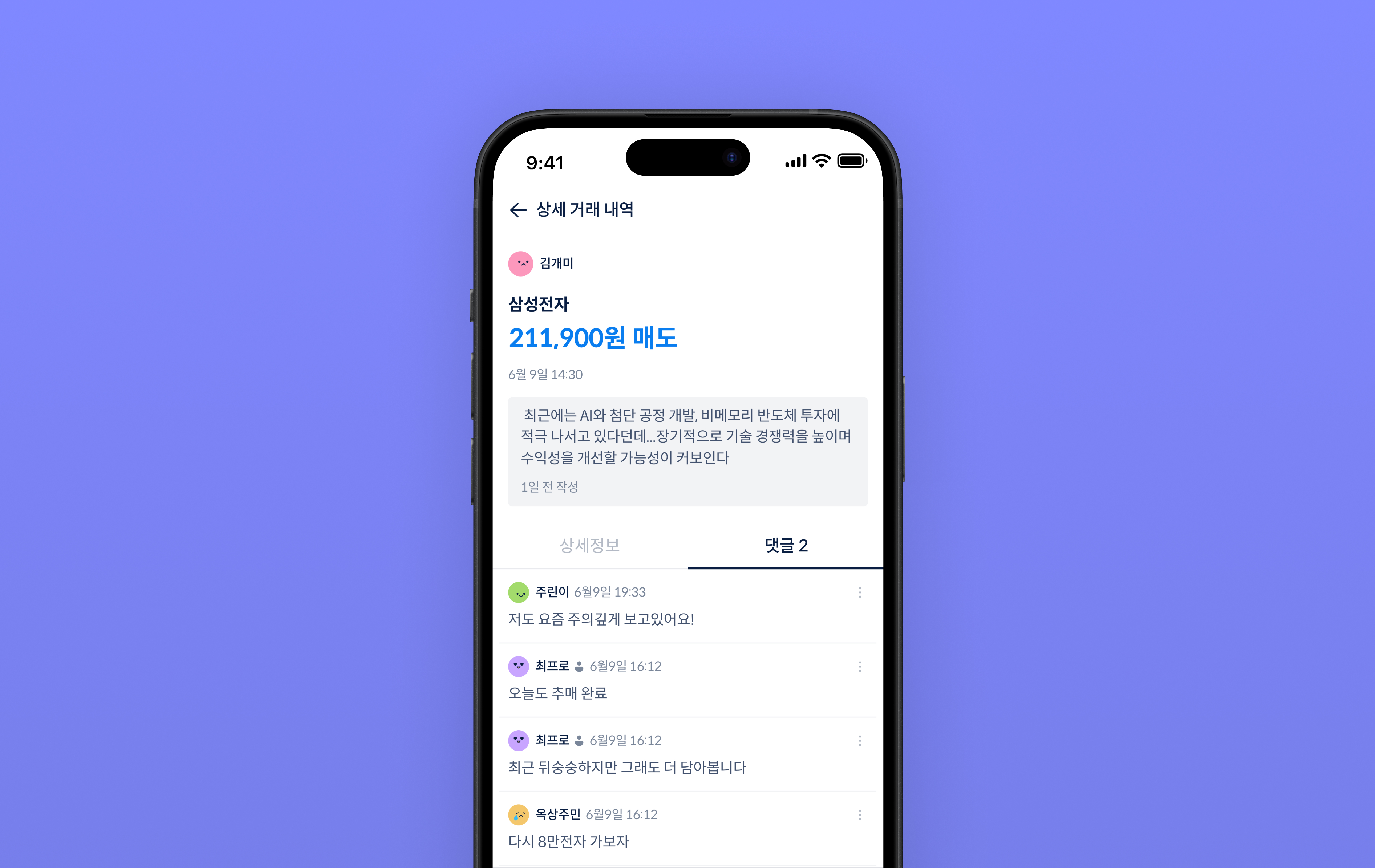 정보 구조 재설계. 거래 내역을 날짜 기준으로 그룹핑하고 주식명·금액의 시각적 위계를 조정했습니다. 닉네임보다 주식 정보가 먼저 눈에 들어오도록 레이아웃을 재구성했습니다.